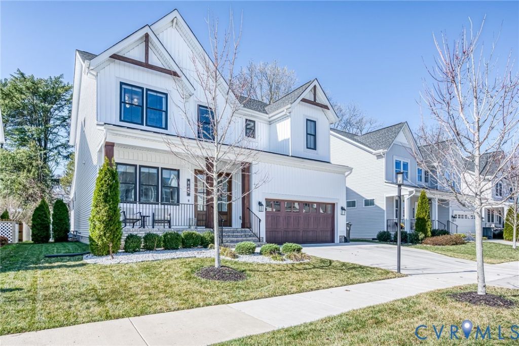 Welcome to this thoughtfully designed modern farmhouse in the heart of Mechanicsville - where architectural detail, elevated finishes, and an entertainer's backyard come together seamlessly. From the moment you arrive, the curb appeal makes a statement. Stained wood porch columns, black-trim windows, metal roof accents, and a rich mahogany-stained garage door create a refined contrast against the clean board-and-batten exterior. An expanded driveway provides additional parking, while the stamped concrete walkway offers a cohesive transition from front to back. Step inside and you're greeted by soaring 10-foot ceilings, 8-foot doors, and refined trim details that immediately set the tone. The tray ceiling in the foyer adds dimension, leading into a dramatic family room anchored by a coffered ceiling and a striking floor-to-ceiling porcelain see-through fireplace. The kitchen is equal parts statement and function. A waterfall island wrapped in Palermo quartz serves as the centerpiece, complemented by Eternal Noir quartz countertops that continue throughout the perimeter and even into the custom dining table for a seamless designer finish. A five-burner gas cooktop, curved bell-style hood, wet bar with beverage center make everyday living and entertaining effortless. Laminate flooring flows throughout the home. The owner's suite is a private retreat, highlighted by a tray ceiling and a spa-inspired bath featuring a zero-entry shower with a ceiling-mounted rain head and secondary shower fixture. Quartz vanities and custom closet systems blend luxury with practicality. And then there's the backyard - truly an extension of the home. Designed for entertaining and relaxation alike, the expansive stamped concrete patio, covered deck, and fully built-in outdoor kitchen create a resort-style setting. Featuring a Weber grill, built-in sink, stone surround, tiled backsplash, and gas connections ready for expansion, this outdoor space is turnkey and built to impress.
